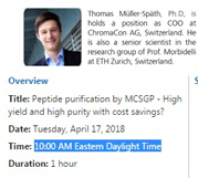 主講人:Thomas Müller-Sp?th, COO of ChromaCon 內(nèi)容:Purification by MCSGP - High yield and High Purity with Cost Savings 時(shí)間:2018年4月17日,星期二,北京時(shí)間22:00(即10:00 AM Eastern Daylight Time) 時(shí)長(zhǎng):1小時(shí)
