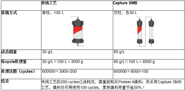 ? ? ?Capture SMB是將第一根層析柱的抗體/蛋白流穿繼續(xù)上樣至第二根層析柱,待第一根層析柱完全滿載后,方結(jié)束其上樣進(jìn)行淋洗,并繼續(xù)進(jìn)行洗脫、再生、再平衡操作,而此時(shí)第二根層析柱會(huì)獨(dú)立進(jìn)行上樣操作。通過(guò)切換柱位操作,保證2根層析柱的洗脫、再生、上樣等操作交替銜接進(jìn)行,從而實(shí)現(xiàn)工藝與系統(tǒng)硬件設(shè)計(jì)的完美結(jié)合,使填料利用率最大化,累積用量大為縮減。