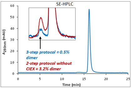 ? ? ? ?最終產(chǎn)品經(jīng)SE-HPLC檢測,純度高達(dá)99.5%,二聚體含量僅為0.5%,比Protein A - Desalting兩步層析所得產(chǎn)品的二聚體含量降低近6倍,該產(chǎn)品可直接用于氨基酸序列測定、二硫鍵測定以及糖型分析等高純度要求的檢測。