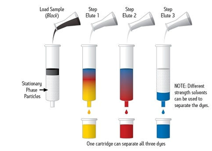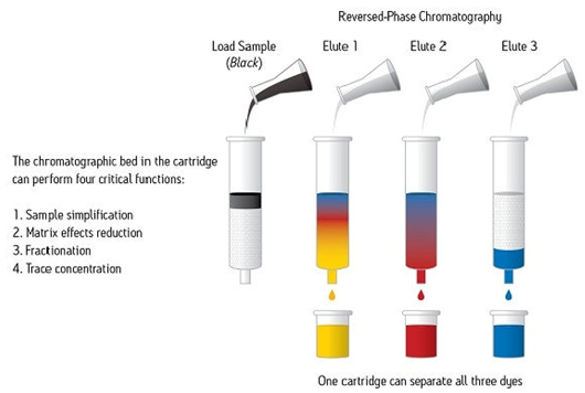 SPE通常是一種使用裝在柱芯型裝置內(nèi)的固體顆粒和色譜填充材料對(duì)樣品中的不同組分進(jìn)行化學(xué)分離的樣品制備技術(shù)。樣品幾乎始終呈液態(tài),但特殊應(yīng)用項(xiàng)目可能使用氣相中的某些樣品進(jìn)行。圖1顯示出一份樣品(圖示為黑色)正在使用SPE裝置進(jìn)行處理,以使組成該樣品的每種染色組分通過色譜分析實(shí)現(xiàn)分離。