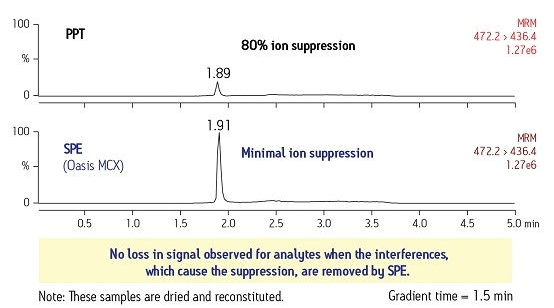 在有些情況下,源自樣品基質(zhì)的干擾物可能會(huì)增加某種化合物的信號(hào),這叫做離子增強(qiáng),可導(dǎo)致響應(yīng)值偏高。適當(dāng)?shù)腟PE方法可通過將干擾物與該化合物分離開來而最大限度減弱這種效應(yīng),從而使響應(yīng)值更準(zhǔn)確。