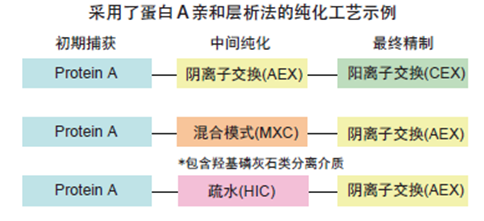 ??? 各種模式中,蛋白A親和層析法可獲得高純度的單抗,因此普遍用于初始純化步驟(即初期捕獲)中。離子交換層析法 ( IEC ) 的高載量特點(diǎn)也使之在抗體的制備純化中被廣泛采用。疏水相互作用層析法 ( HIC ) 具有去除抗體多聚體以及脫落的蛋白 A 配體等雜質(zhì)的性能?;旌夏J綄游龇ǎ?/span>MXC,含羥基磷灰石類分離介質(zhì))也被運(yùn)用到了抗體的層析純化工藝之中。