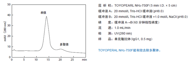 ????陰離子交換填料在抗體的純化工藝中一般通過流穿模式來去除樣品中的宿主細(xì)胞蛋白、核酸、內(nèi)毒素、多聚體等雜質(zhì)。? TOYOPEARL GigaCap Q-650MTOYOPEARL Q-600C AR、TOYOPEARL NH2 -750F 等,均是高載量型的優(yōu)異層析填料。