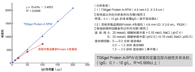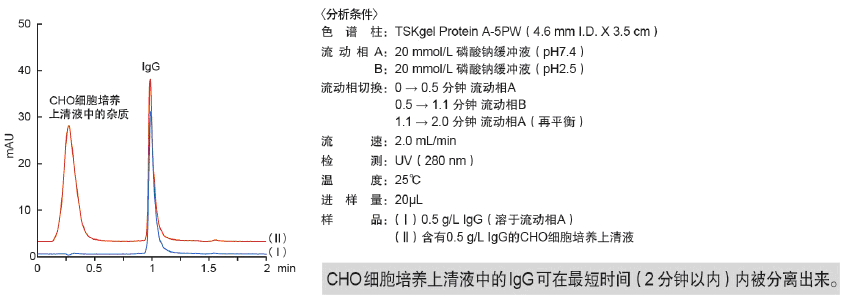 目前,人們對以免疫球蛋白(IgG)為主的抗體藥物的需求日益高漲。在抗體藥物的研發(fā)以及制備工藝建設(shè)中,由于IgG表達(dá)需進(jìn)行篩選,所以必須快速及準(zhǔn)確地定量細(xì)胞培養(yǎng)液中的IgG。而且,即使在工業(yè)制備過程中,IgG的定量也是重要的質(zhì)量控制項目之一。為此,日本東曹公司特推出以多孔親水性聚合物為基質(zhì),表面鍵合有重組Protein A官能團(tuán)的TSKgel Protein A-5PW親和色譜柱,用于IgG的快速、高分離度分析。