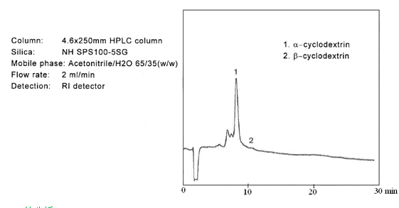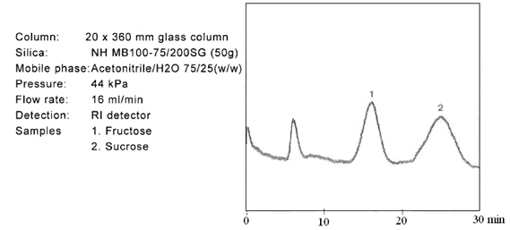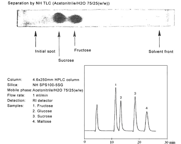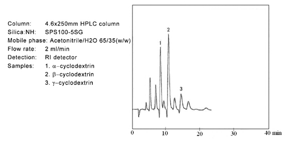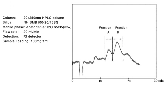 ? ? ? 糖類物質(zhì)的分析和制備,在液相色譜領(lǐng)域占有重要的地位。迄今為止,大多數(shù)的分離介質(zhì)僅僅局限在分析級(jí)別。但是富士硅膠研發(fā)出用于制備色譜的新的氨基硅膠。當(dāng)使用高水相為流動(dòng)相時(shí),一般的氨基填料會(huì)暴露出很多問(wèn)題。氨基硅膠的pH值很高,一般pH為9.0,在這樣高的pH條件下,目標(biāo)化合物一般都會(huì)變性,并且會(huì)毀壞硅膠基質(zhì)的表面??紤]到這些問(wèn)題,富士公司研發(fā)出新的氨基硅膠填料,稱之為NH SG硅膠。NH SG硅膠可以最小化甚至是避免上述問(wèn)題,并且對(duì)糖類化合物進(jìn)行更好的分離。