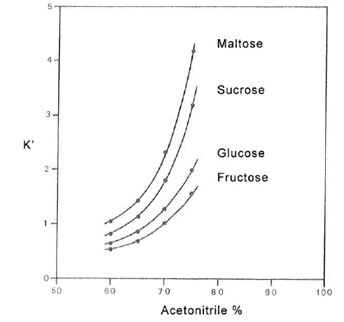 糖類的分離通常用到的是乙腈/水做流動(dòng)相。當(dāng)乙腈的含量增加,保留因子k’增加。但是乙腈的含量需要仔細(xì)的控制,因?yàn)殡S著乙腈含量的增加,樣品的溶解性會(huì)變差。