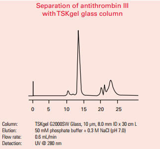 SW型柱以高多孔性硅膠顆粒為基礎(chǔ),其表面因受二醇功能基配體的衍生作用保護(hù)而不與蛋白質(zhì)相互作用。TSKgel SW型柱憑借其大孔隙容積而勝過其它硅膠基質(zhì)或聚合物高性能尺寸排阻柱。