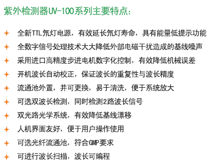 檢測器指能檢測色譜柱流出組分及其量的變化的器件。對檢測器的要求是:靈敏度高,線性范圍寬,重現(xiàn)性好,穩(wěn)定性好,響應速度快,對不同物質(zhì)的響應有規(guī)律性及可預測性。QuikSep UV全波長檢測器可設置2個波長同時檢測!