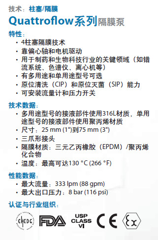 uattroflow的產(chǎn)品需要主要供應于密封性好、純度高、無菌的制藥業(yè)和生物技術產(chǎn)業(yè)。Quattroflow的容積式泵產(chǎn)品采用無機械密封的四活塞隔膜技術,該泵由一個偏心軸桿及發(fā)動機驅動。