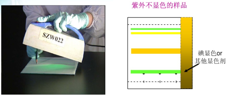 二照:在紫外燈下觀察有無暗斑或熒光斑點(diǎn)