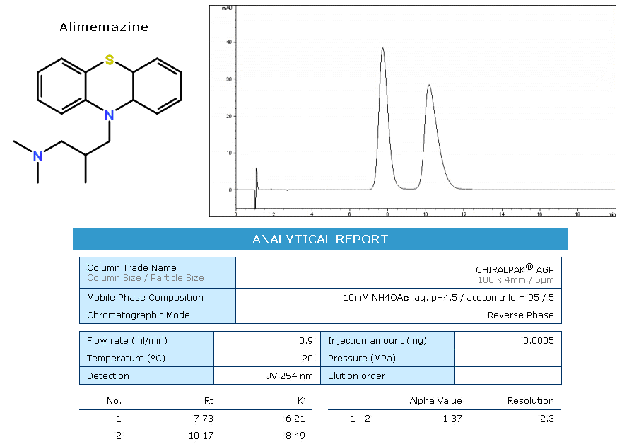 AGP為蛋白質(zhì)鍵合型手性柱,硅膠表面共價(jià)鍵合有α1-酸性糖蛋白。適用于反相系統(tǒng)。 在所有蛋白質(zhì)鍵合手性柱中,具有最廣泛的適用范圍: 1. 胺類化合物(一級胺,二級胺,三級胺,四級胺類化合物) 2. 酸性化合物(強(qiáng)酸性化合物,弱酸性化合物) 3. 非質(zhì)子類化合物(酰胺類化合物,酯類化合物,醇類化合物,亞砜類化合物等)
