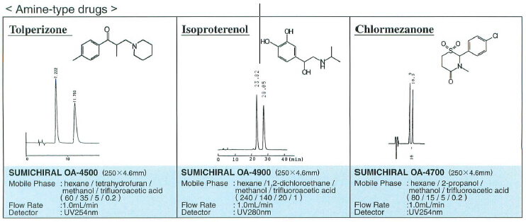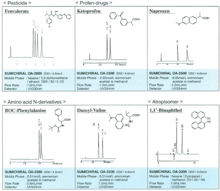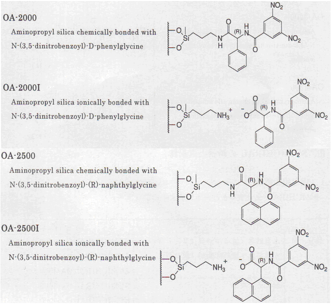 Pirkle型手性柱是將氨基酸的3,5-二硝基苯?;苌镒鳛槭中赃x擇劑,改良型是將萘乙二胺二鹽酸鹽作為手性選擇劑。主要通過電荷移動和氫結(jié)合相互作用來識別手性。OA-2500或OA-3300可有效分離含有-COOH的手性化合物。采用將氨基酸的N位進行NBD標記的方法,用于D型氨基酸的微量分析。此外,OA-4000系列在胺類系醫(yī)藥品、酒精類、酯、氫胺等眾多化合物正相直接分離方面發(fā)揮了優(yōu)越的性能。