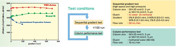 YMC-Actus具有高理論塔板數(shù)、高分離能的優(yōu)點(diǎn)。即使在壓力變化很大的苛刻條件下也不會引起該性能的降低。