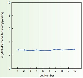 上圖所示,顯示了對羥基苯甲酸甲酯/2,6-二甲基吡啶(Methylparaben/2,6-Dimethylpyridine)在YMC-Pack ODS-AM液相色譜柱上10次的分離因子(α)。YMC公司在生產(chǎn)過程中采用的嚴格質量控制體系,以保證產(chǎn)品生產(chǎn)批間的差異最小,提供高再現(xiàn)性的堿性化合物分析柱。